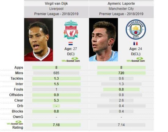 在范迪克加盟利物浦后,红军浦在22场比赛中失13球,而拉波尔特加盟曼城后,联赛卫冕冠军在17场联赛中丢8球。而在本赛季的前八轮英超联赛过后,两人都交出了亮眼的防守数据。范迪克场均铲断1.3次、场均拦截1.5次、场均解围5.3次、场均封堵0.8次。而拉波尔特以上几个数据分别是0.6次、1.3次、2.6次一级0.4次。虽然从数据上看,拉波尔特比范迪克低了不少,但是他的防守数据在英超依旧算作顶级,场均评分7.14分,仅比范迪克的7.18分少0.04分。