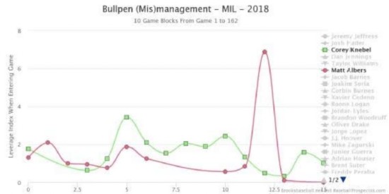 但是,与大多数球队的牛棚一样,这个赛季有关酿酒人牛棚的故事比他们这一周中的表现更为曲折。在一个赛季中给球队搭建起一个优质的牛棚框架,这样的任务和球队的其他部分相比 - 甚至说比球队的任何其他部分 - 所经历的曲折都要大得多。好的牛棚投手可能一瞬间便变成了路人,有些表现稀烂的投手有可能一下子就变得无人能挡,在高压条件下不断地更换投手,最终,当最关键的比赛中牛棚的精彩发挥将极大地激发他们对自身实力的自信。