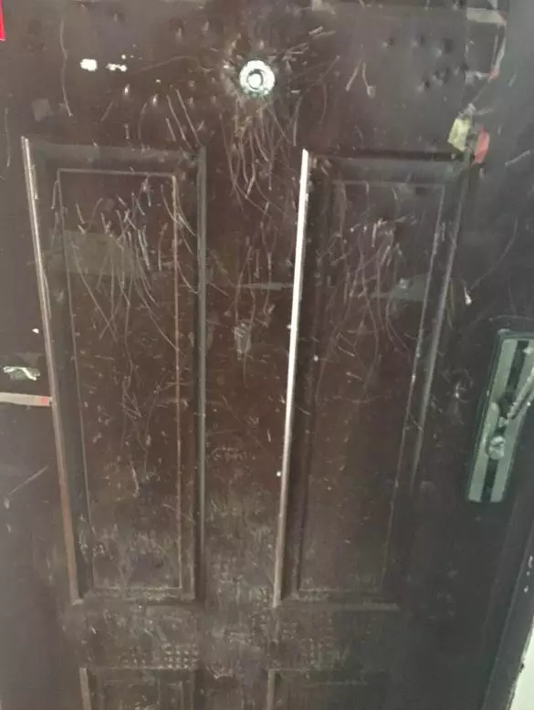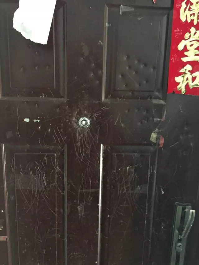 ▲房门被砸得面目全非。