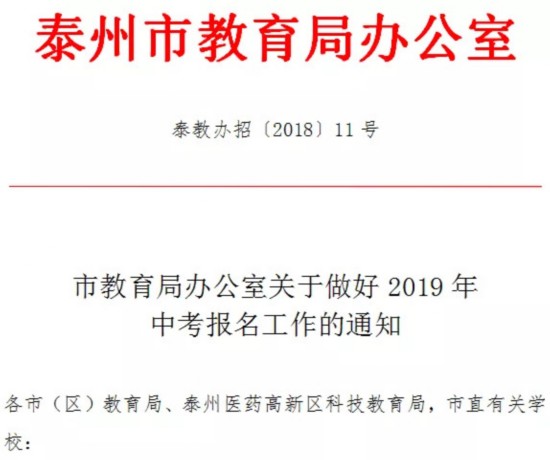2019年我市高中阶段学校招生考试报名工作即将开始。统一进行网上报名(登录泰州教育网(http://jyj.taizhou.gov.cn),点击“中考招生”,进入中考管理平台),网报时间为2018年10月22日-26日,逾期不接受报名。