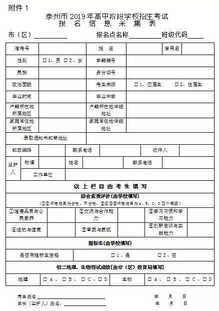 报名前,认真阅读《泰州市2019年高中阶段学校招生考试报名信息采集表》(附件1)填表说明,结合本人实际情况,认真填写《泰州市2019年高中阶段学校招生考试报名信息采集表》(登录泰州教育网(http://jyj.taizhou.gov.cn),点击“中考招生”,进入中考管理平台后下载表格)。填写完成后,考生须认真校核所填信息是否与本人的实际情况一致。考生须在规定的时间内凭准考号登录网上中考报名系统,首次登录系统必须重新设置自己的密码。登录后,考生将《泰州市2019年高中阶段学校招生考试报名信息采集表》上的内容依次准确录入到相应栏内,完成后立即网上提交。