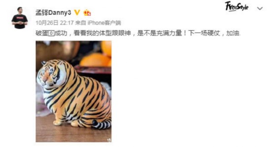 在与四川的比赛之后,孟铎在自己的社交平台晒出了一只“胖老虎”并打趣自己:“破蛋成功,看看我的体型跟眼神,是不是充满力量!下一场硬仗,加油. ”打趣自己的同时,孟铎确实也对自己目前的表现非常不满意。