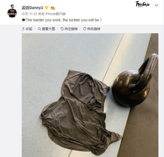 其实孟铎也正在通过个人训练逐渐寻找状态,在备战28号与新疆的焦点之战前,孟铎在个人的社交平台上晒出了被汗水湿透的训练服并说:“The harder you work, the luckier you will be!”意思是“你越努力就会越幸运”