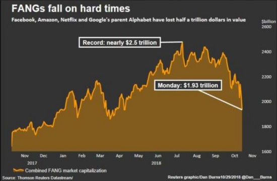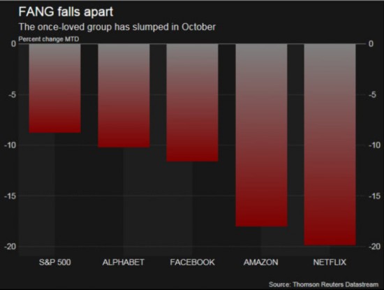 进入10月以来,FANG的股价普遍下跌14%至24%,近年来华尔街最受欢迎的四大股票似乎陷入了困境。