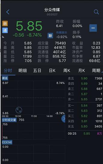 腾讯科技讯 10月30日消息,昨日刚刚发布最新一季度财报的分众传媒,今日开盘股价大跌8.74%,报价5.85元,市值缩水至857.7亿元。