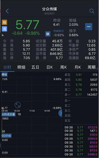 腾讯科技讯 10月30日消息,昨日刚刚发布最新一季度财报的分众传媒,股价今日低开后迅速封于跌停板5.77元,市值缩水至846.9亿元。