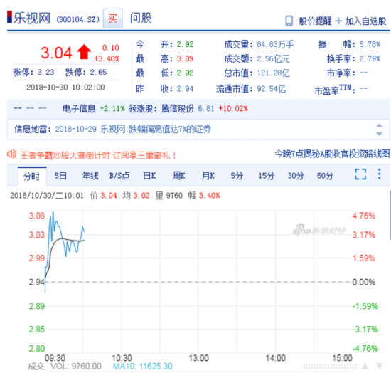 新浪科技讯 10月30日上午消息,截止10:02,乐视((300104.SZ)盘中股价上涨3.40%,报3.04元。