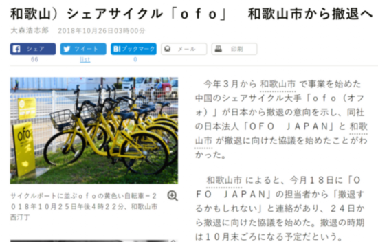 据报道,由于中国市场竞争激化和乱停乱放问题的应对成本,ofo经营能力的下降。10月中旬开始,日本滋贺县大津市、和歌山县和歌山市和福冈县北九州市陆续接到ofo方面的电话,被告知打算退出日本市场。
