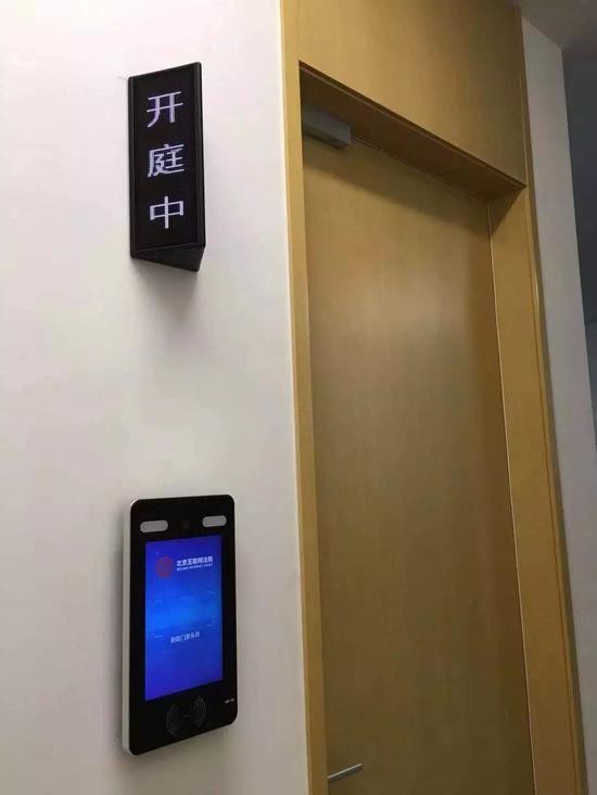 庭审过程中,网络法庭呈现出一种封闭的状态。法庭一侧是一整块玻璃幕墙,该幕墙采用电子调光玻璃制作。为避免干扰,上午庭审开始后,原本透明的玻璃幕墙被调整到雾化状态,外面的人无法看到法庭内部。法庭门口的电子牌也被调为“开庭中”,同时,门口的人脸识别门禁系统启动,无关人员无法再进入法庭。