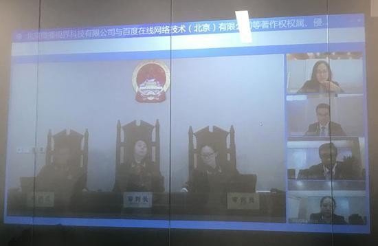 上午的庭审在北京互联网法院观摩一法庭开庭,案件正是以一种全程在线审理的方式进行。原被告均无需到庭,而是通过法庭正前方墙面上的一块长条型电子屏幕以视频的方式呈现。大屏幕被划分为三块,左右两侧分别为原被告的影像,中间则是审判席。