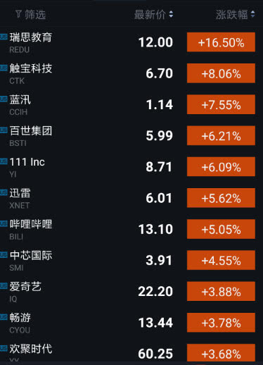 中国概念股涨跌各半,其中涨幅较大的公司包括:瑞思教育(涨16.50%)、触宝科技(涨8.06%)、蓝汛(涨7.55%)、百世集团(涨6.21%)、111集团(涨6.09%)、迅雷(涨5.62%)、哔哩哔哩(涨5.05%)、中芯国际(涨4.55%)、爱奇艺(涨3.88%)、畅游(涨3.78%)、欢聚时代(涨3.68%)、极光数据(涨3.61%)、好未来(涨3.37%)。