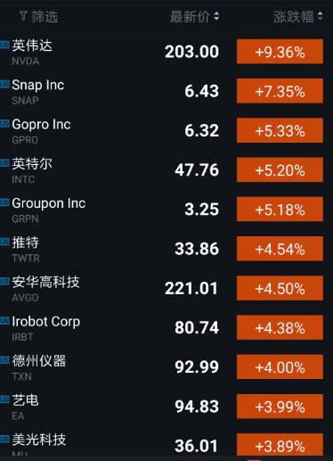 美国科技股全线上涨,其中涨幅较大的公司包括:英伟达(涨9.36%)、Snap(涨7.35%)、Gopro(涨5.33%)、英特尔(涨5.20%)、Groupon(涨5.18%)、Twitter(涨4.54%)、博通(涨4.50%)、iRobot(涨4.38%)、德州仪器(涨4.00%)、艺电(涨3.99%)、美光科技(涨3.89%)、Dropbox(涨3.59%)、Roku(涨3.55%)、甲骨文(涨3.30%)、Verizon(涨3.01%)、Facebook(涨2.91%)。