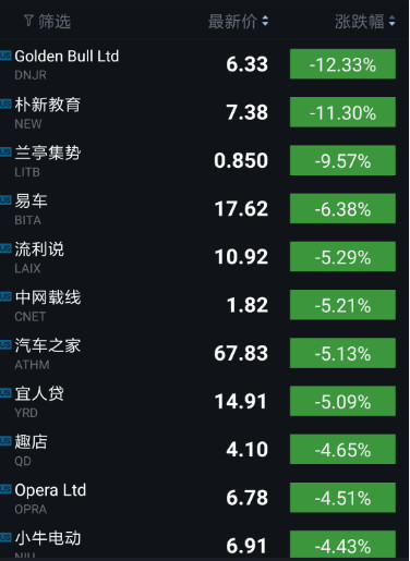 另一方面,跌幅较大的公司包括:点牛金融(跌12.33%)、朴新教育(跌11.30%)、兰亭集势(跌9.57%)、易车(跌6.38%)、流利说(跌5.29%)、中网载线(跌5.21%)、汽车之家(跌5.13%)、宜人贷(跌5.09%)、趣店(跌4.65%)、Opera(跌4.51%)、小牛电动(跌4.43%)、小赢科技(跌3.95%)、蔚来汽车(跌3.88%)、格林酒店(跌2.81%)、乐居(跌2.45%)。