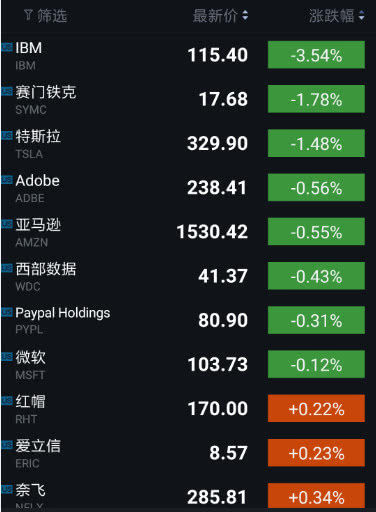 另一方面,跌幅较大的公司包括:IBM(跌3.54%)、赛门铁克(跌1.78%)、特斯拉(跌1.48%)、Adobe(跌0.56%)、亚马逊(跌0.55%)。
