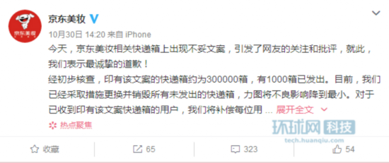 近日,京东美妆相关快递箱上出现不妥文案,引发了网友的关注和批评,就此,我们表示最诚挚的道歉!
