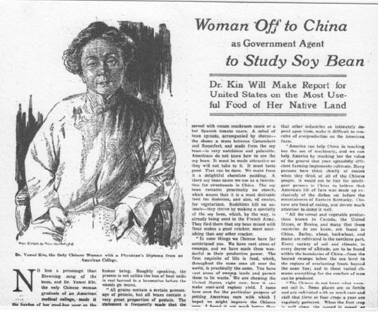 一战期间,美国农业部任命金韵梅到中国进行调研,以便美国更好地利用大豆。图片来源:美国报纸当时的报道截图