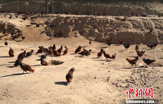 2017年10月,在兰州市经济技术开发区的帮扶下,兰州市皋兰县水阜镇在燕儿坪村建起土鸡散养场,这也是该镇首个村集体产业。燕儿坪村有160多户人家,其中建档立卡户24户,经过一年多的帮扶,现在该村只剩一户未脱贫。图为散养的土鸡。 杜萍 摄