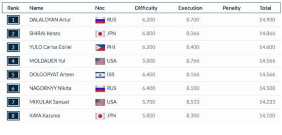 腾讯体育讯 北京时间11月2日,2018年世界体操锦标赛在卡塔尔多哈展开单项决赛的较量。在刚刚结束的男子自由体操决赛中,新科全能冠军、俄罗斯名将达拉洛殷发挥出色,以14.90分拿到冠军,日本名将白井健三以14.866分摘得银牌,铜牌归属菲律宾新秀尤洛-卡洛斯,他的成绩是14.60。