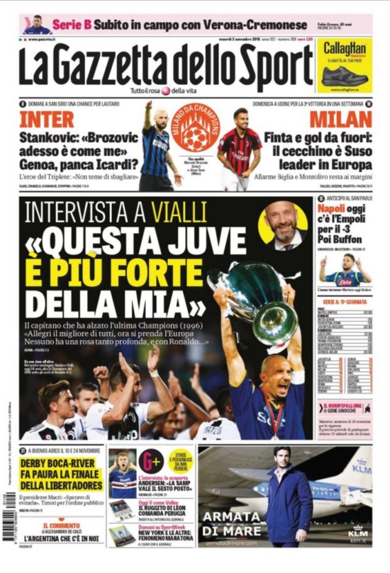 《米兰体育报》头版:维亚利说现在这支尤文强于22年前欧冠冠军队