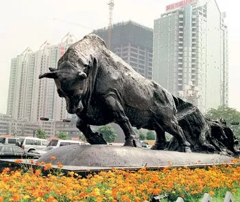 在深圳市委大院大门口,有一座青铜雕塑拓荒牛。