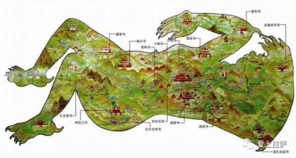 但是尼泊尔赤尊公主在宫前修建寺庙不成,于是以重金礼请唐文成公主为其推测建寺地址。据说“文成公主依据中原的《八十种五行算观察法》来细推观察,而知道雪域西藏的地形,俨若罗刹魔女仰卧的形状”。而且进一步勘察得知,拉萨卧塘湖即魔女的心血,三山乃魔女的心窍和脉络、绕木齐(小昭寺)为龙神所居,鲁浦(药王山东崖下的查拉鲁浦)为黑恶龙栖息地,达瓦泽独干毒树下是鬼魅及非人所居处,东南的一处地熬,状如大象上阵等等。