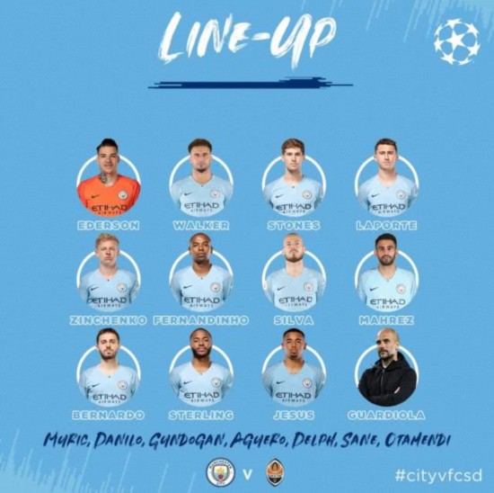 替补:49-穆里奇、3-达尼洛、8-京多安、10-阿圭罗、18-德尔夫、19-萨内、30-奥塔门迪