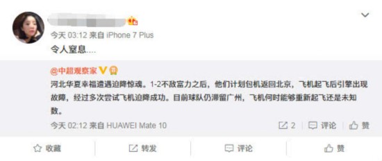 据名为“中超观察家”微博网友爆料,河北华夏幸福赛后返京途中上演“惊魂一幕”,“1-2不敌富力之后,他们(河北队)计划包机返回北京,飞机起飞后引擎出现故障,经过多次尝试飞机迫降成功。目前球队仍滞留广州,飞机何时能够重新起飞还是未知数。”