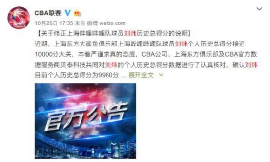 直到这个赛季开始后,CBA公司为了确定这一数据,于10月26日公布了《关于修正上海哔哩哔哩队球员刘炜历史总得分的说明》,表示经过和上海男篮、CBA数据服务商的对比,截止2018年10月26日(2018-19常规赛四轮后)刘炜个人历史总得分为9960分,比之前中国篮协旧数据系统中的9947分增加了13分,这才统一了说法。要知道CBA公司发文确认球员的个人得分数据,在CBA24年的历史上也属首次。