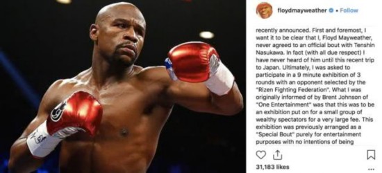 从梅威瑟的表态中可以看出,他本人在前往日本之前并不知要与那须川天心进行正式比赛,甚至连对手的来历也并不清楚。唯一知情的是,要进行一场娱乐表演赛。所以,当他在东京出席新闻发布会发现与事实不符后,其团队马上叫停了谈判。