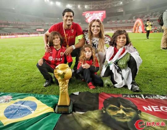 这种大场面,自然也少不了“爱凑热闹”的外援们的份。胡尔克的妻子和三个孩子集体亮相,一头长发的大女儿在脑门上还特意印上了两个大大的中文汉字:必胜,很是应景。