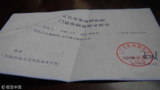 北京市垂杨柳医院诊断,她的症状为“创伤后应激障碍”、“亚木僵”。到其他医院住院治疗了一段不见好,父母又带她去北戴河。