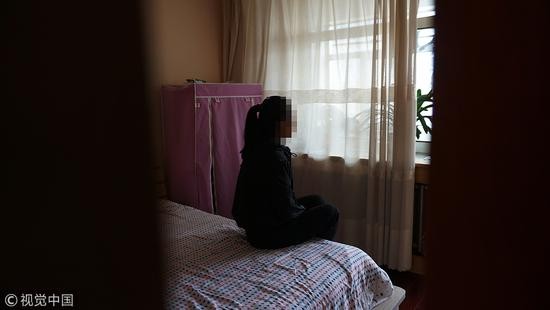 2016年06月27日,内蒙古自治区满洲里市,一名受害女孩坐在床边。新京报记者曹晓波 摄