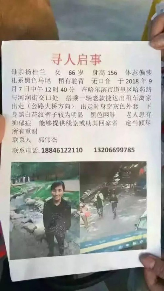 据郭先生提供的寻人启事上显示——2018年9月7日中午12时40分,老人杨桂兰(女,66岁,身高156,家住哈市道里区建国北头道街,扎系黑色马尾,稍有驼背,出走时身穿灰色外套,下身黑白花纹裤子,脚穿黑色网鞋)。