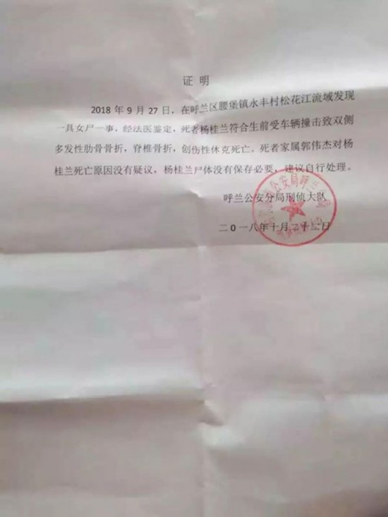 9月28日,郭先生接到警方打来的电话,称有人在呼兰区松花江边发现了杨女士的尸体。
