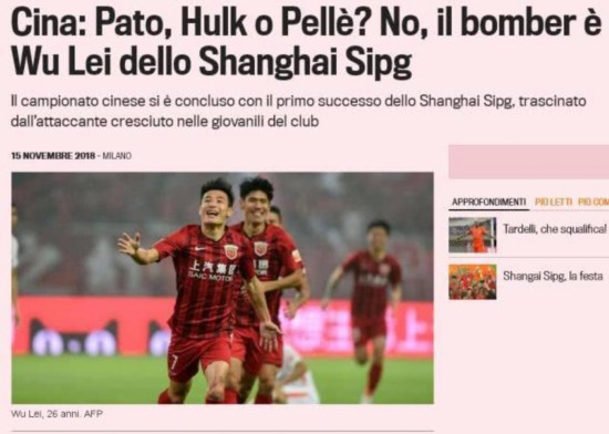 《米兰体育报》报道中表示,1991年出生于中国南京的武磊,在代表上港队出战的29场联赛中,攻入27球并帮助上港夺得冠军,这是一个难以置信的成绩,16球的佩莱,15球的帕托,13球的浩克,12球的拉维奇,11球的埃德尔,他们都无法取得这样的数据,落后武磊的还有巴坎布、扎哈维、奥斯卡、伊哈洛和保利尼奥这些球星。