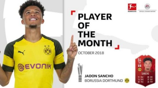 桑乔今年只有18岁,可以踢边锋和边后卫,他在上个月比赛中参与制造4球,包括对阵柏林赫塔时梅开二度,成为德甲历史上第二年轻的单场打进两球的球员。桑乔也凭借自己的出色表现,帮助多特蒙德在10月德甲联赛中获得了2胜1平的成绩。