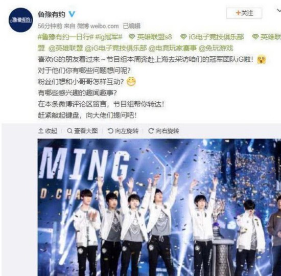 《鲁豫有约》官博称将邀请iG战队来录制节目