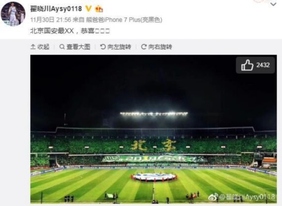 翟晓川庆祝国安夺冠