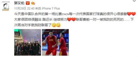 大比分取胜让男篮众将心情大好,赛后郭艾伦上传了一张训练时单防易建联的照片,并表示,“被我防的死死的……下次再当对手就我防联哥了。”真是皮的够可以的。辽宁队队友高诗岩调侃,“这么狠噢,直接给防死了,不给活路奥。”