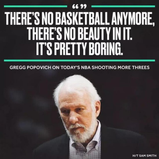 面对如今这个联盟,波波维奇前两天还说了这么一番话:“现在啊,大家都这么重视三分球,而且这被数据解析证明了,这是正确的。现在你赛后拿一张技术统计看,你第一个要看的就是三分。要是你扔进了好多三分,对方没扔进,你就赢了。什么篮板啊,失误啊,转换防守啊,你根本就不用关心。这就是三分球带来的影响,所有人都这么打。我恨这件事。过去20年,我一直恨三分球。这就是为什么我开玩笑说,要不然咱们干脆设立四分球吧。因为如果人人都喜欢看三分,那他们肯定也喜欢看四分球。要是你还有一种五分球,那观众简直得从椅子上飞起来了。那真棒啊。可那不再是篮球了。那没有这项运动的美妙了,那无聊极了。但这就是现实,你就得按这个打。”