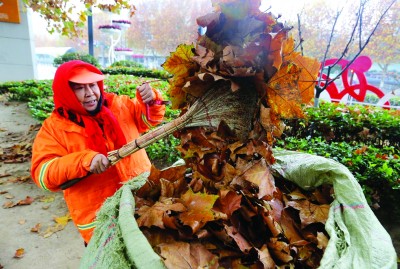 昨日,连云港连云区环卫处的环卫工人正在忙着清扫落叶。当日,连云港市降下小到中雨,行道树上的叶子纷纷掉落。全市环卫工人及时清扫雨水浸泡后的落叶,为市民创造干净、舒心的城市环境。