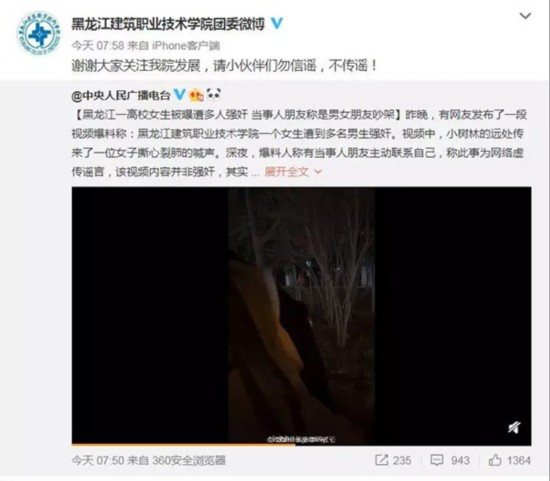 黑龙江建筑职业技术学院团委7日回应,网传黑建筑女生被曝遭多人强奸是谣言,希望大家不要传播谣言。