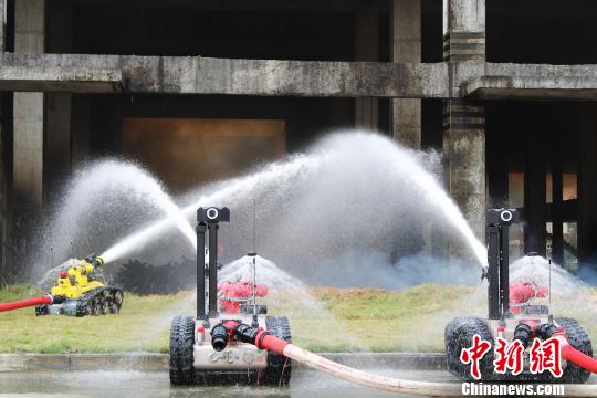 中新网宁德12月12日电 (记者 叶茂)灵巧越障、环境侦测、图像采集、穿越浓烟、喷射水柱……12日,在福建福鼎市举行的一场消防演练中,消防灭火侦查机器人、高倍数泡沫灭火机器人、消防排烟灭火机器人等一台台智能消防机器人在消防员的远程“指挥”下,迅速将一场烈火压制并使之逐渐淡去。