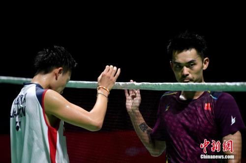 资料图:日本选手桃田贤斗(左)与林丹。中新社记者 吕明 摄