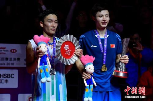12月16日,2018汇丰世界羽联·世界巡回赛总决赛在广州继续进行,中国选手石宇奇(右)战胜日本选手桃田贤斗,夺得男单冠军。中新社记者 陈骥旻 摄