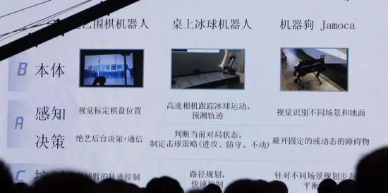 我刚到腾讯的时间不长,现在我做了三个机器人,是为腾讯新大楼的展厅做的,第一个是绝艺围棋机器人,第二是桌上冰球机器人,第三是一个机器狗。大家知道腾讯AI做了一个绝艺围棋AI,但是无论是绝艺还是AlphaGo,都需要有一个人去下子,绝艺告诉一个人应该下哪个子,他就去下那个子。我们现在加了一个机械臂,它自动去完成下子的任务,这是从本体来做的。从感知角度来讲,它要做一个棋盘和机械臂之间的标定,绝艺要通过后台通讯,知道要下哪一步,控制方面就是机械臂的轨迹控制。桌上冰球的机器人,它的感知是一个高速的摄像头,它能够高速的跟踪冰球的位置,然后预测下一步这个冰球在什么地方出现,它有一个决策,就是到底采用攻击的方法还是防卫的方法,控制就是路径规划和快速控制。机器狗的本体是我们和浙大合作的,这个感知系统是我们自己做的,感知系统能够识别不同的场景和地面,能够避开固定的或者动态的障碍物,控制方面就是针对不同的场景,它能够有不同的步态和平衡控制。