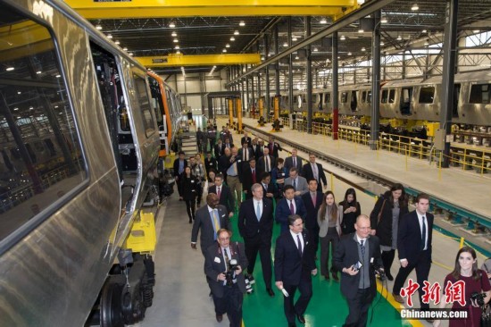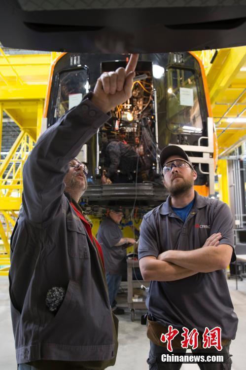 美国中车麻省公司春田工厂来宾参观车辆总装车间。中新社记者 廖攀 摄
