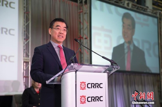 中国驻纽约总领事黄屏在美国中车麻省公司春田工厂首列车下线仪式上致辞。中新社记者 廖攀 摄