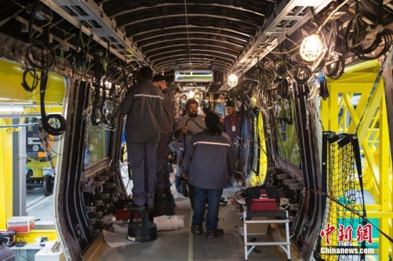 当地时间12月18日,美国中车麻省公司春田工厂车辆总装车间。当日,中国中车集团为波士顿地铁生产的首列车在美国中车麻省公司春田工厂下线。中新社记者 廖攀 摄