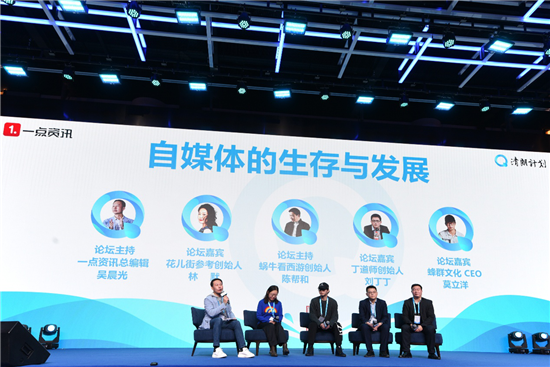 随后,一点资讯总编辑吴晨光与花儿街参考创始人林默、蜂群文化CEO莫力洋、丁道师创始人刘丁丁、蜗牛看西游创始人陈邦和等嘉宾参与了《自媒体的生存与发展》主题论坛讨论。各位头部媒体大咖结合自身经验,与到场观众分享自媒体如何更好的创作与运营,将优质内容触达更多用户。